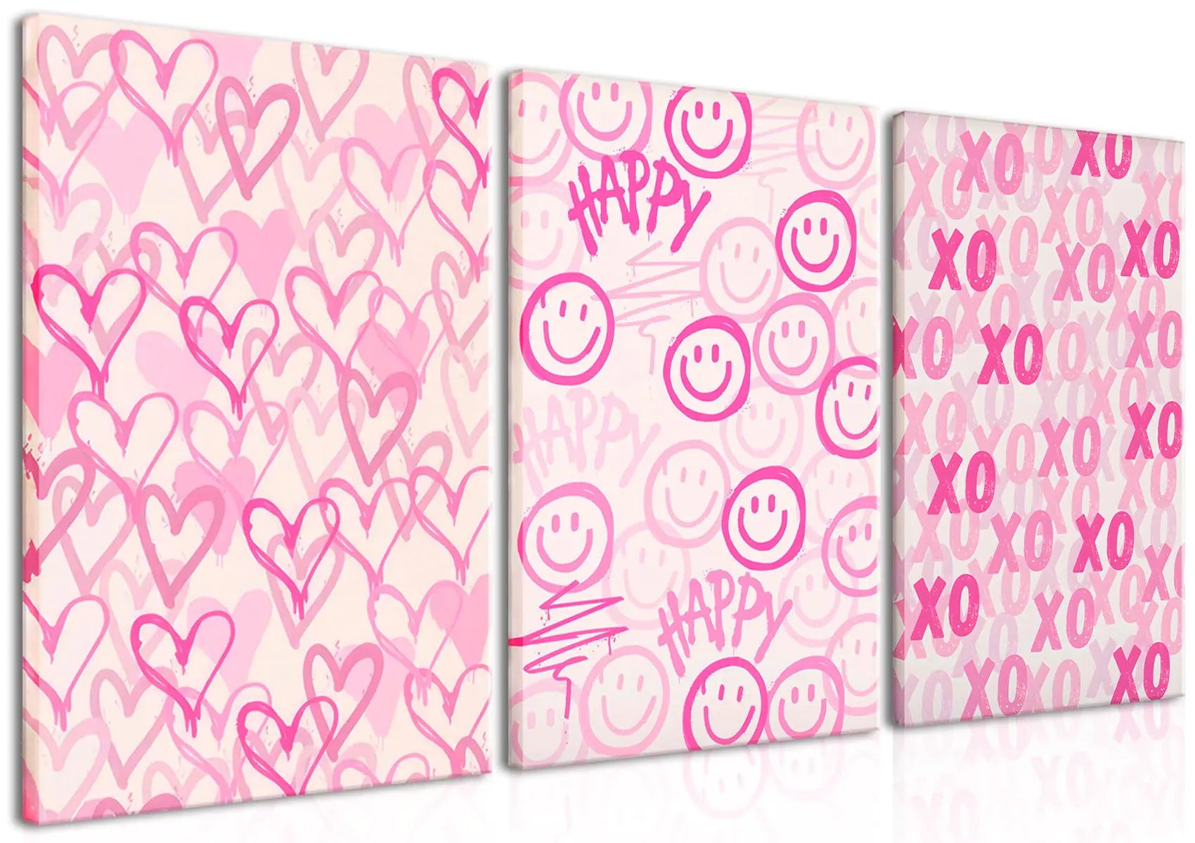 [Versatile Room Enhancement: Elevate any space with this set of 3 pink wall art pieces perfect for enhancing the aesthetics of bedrooms dorms galleries or homes. "Modern Aesthetic: Featuring heart-shaped doodles smiley faces and XO motifs these canvas prints offer a contemporary touch to girls bedrooms or any room seeking a modern vibe." HIGH QUALITY: Each framed canvas print measures 16x24 inches and is crafted from premium materials with meticulous attention to detail and is professionally printed on canvas to ensure crisp images and vibrant colors making them perfect for long-term display Ideal. "Ideal for Gifting: This wall art set isnt just decor; its a thoughtful gift for teen girls college students or friends adding warmth and personality to their living spaces." Easy Installation: Decorating your space has never been easier – simply hang these pink wall art pieces for an instant aesthetic upgrade. Whether displayed individually or as a set they effortlessly complement any room decor style.]